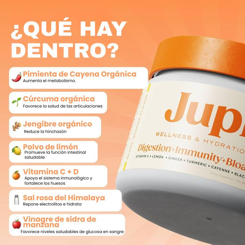 Jupi combina cúrcuma, jengibre y vitamina C para ayudarte a reducir la inflamación y la pesadez estomacal. Sentí la ligereza que tu cuerpo merece desde el primer vaso.