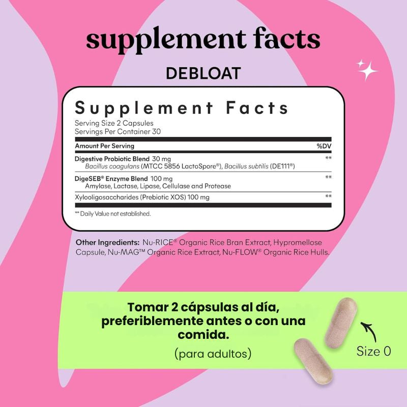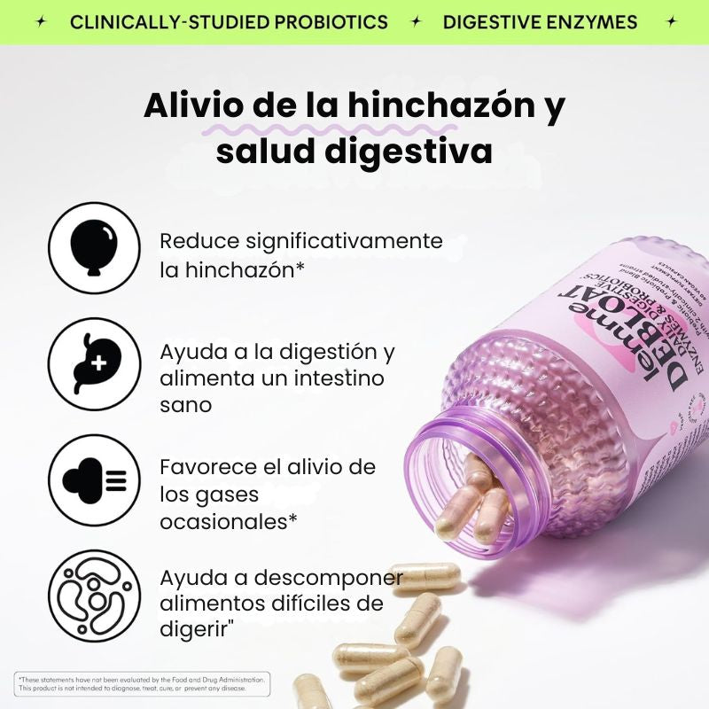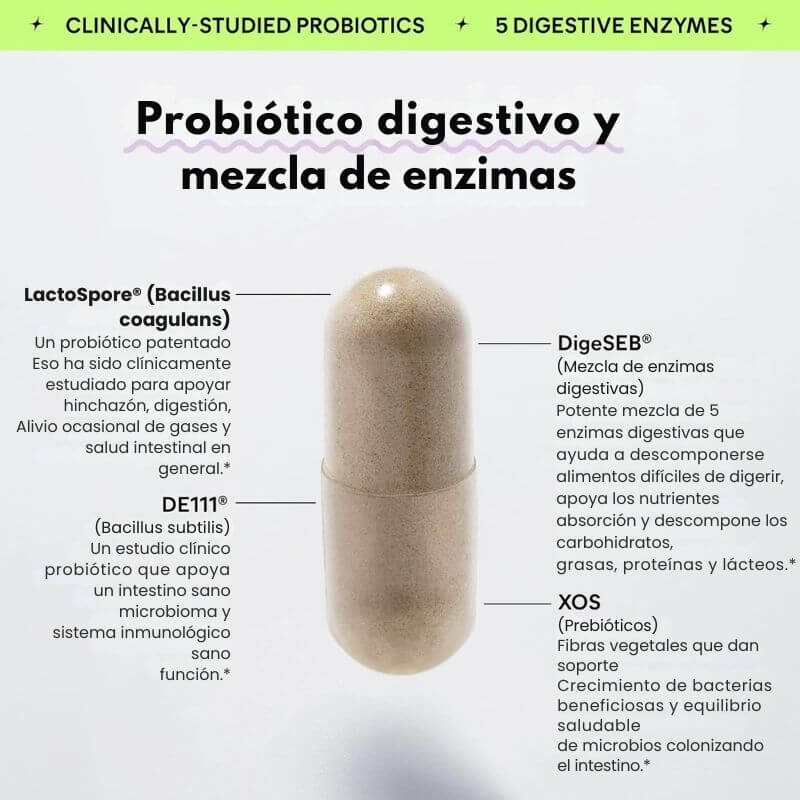 Probióticos + Prebióticos + 5 Enzimas digestivas trabajan juntos para equilibrar tu flora intestinal y mejorar tu digestión desde el núcleo.